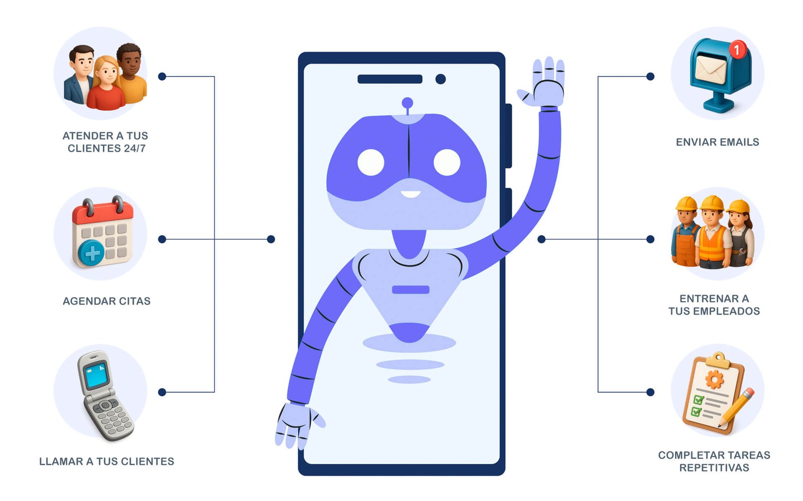 En iWantica te Ayudamos con la Creación de Agentes Inteligentes para la Atención a tus Clientes, Automatizaciones de tu tareas operativas, Creación de Sistemas Inteligentes con conocimientos de tu negocio y el Diseño de tu Página Web.